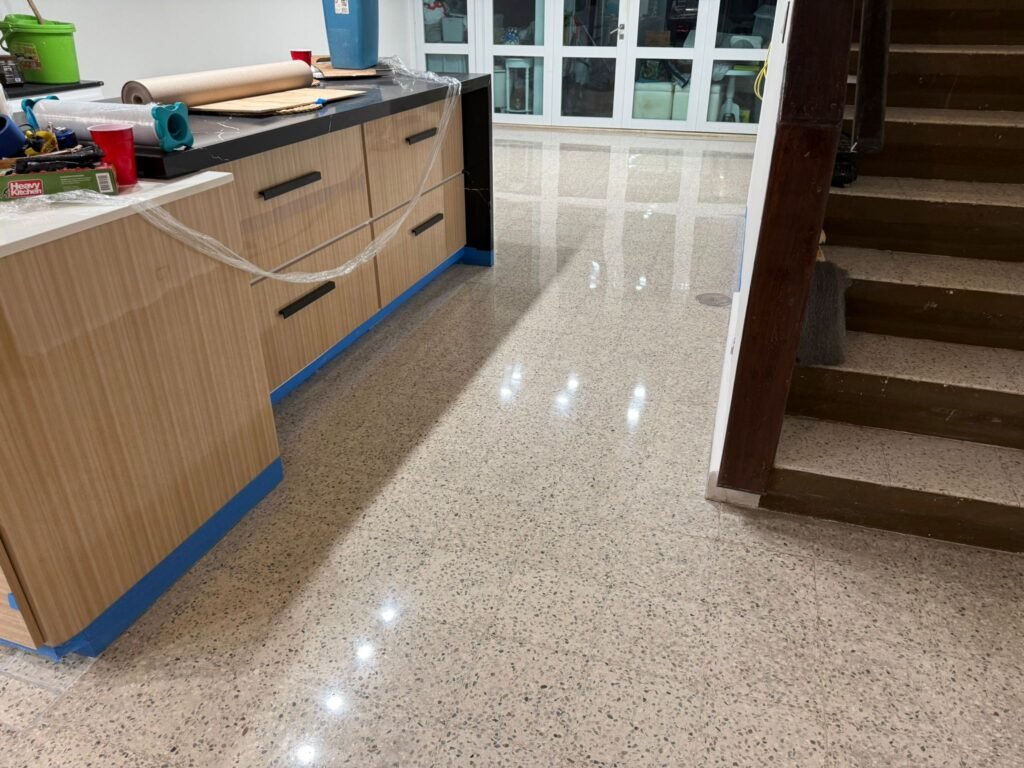 El pulido de pisos en un proceso técnico que restarura, limpia y abrillanta superficies como mármol, concreto y terrazo, eliminando marcas, manchas y rasguños mediante el uso de máquinas y productos especializados.